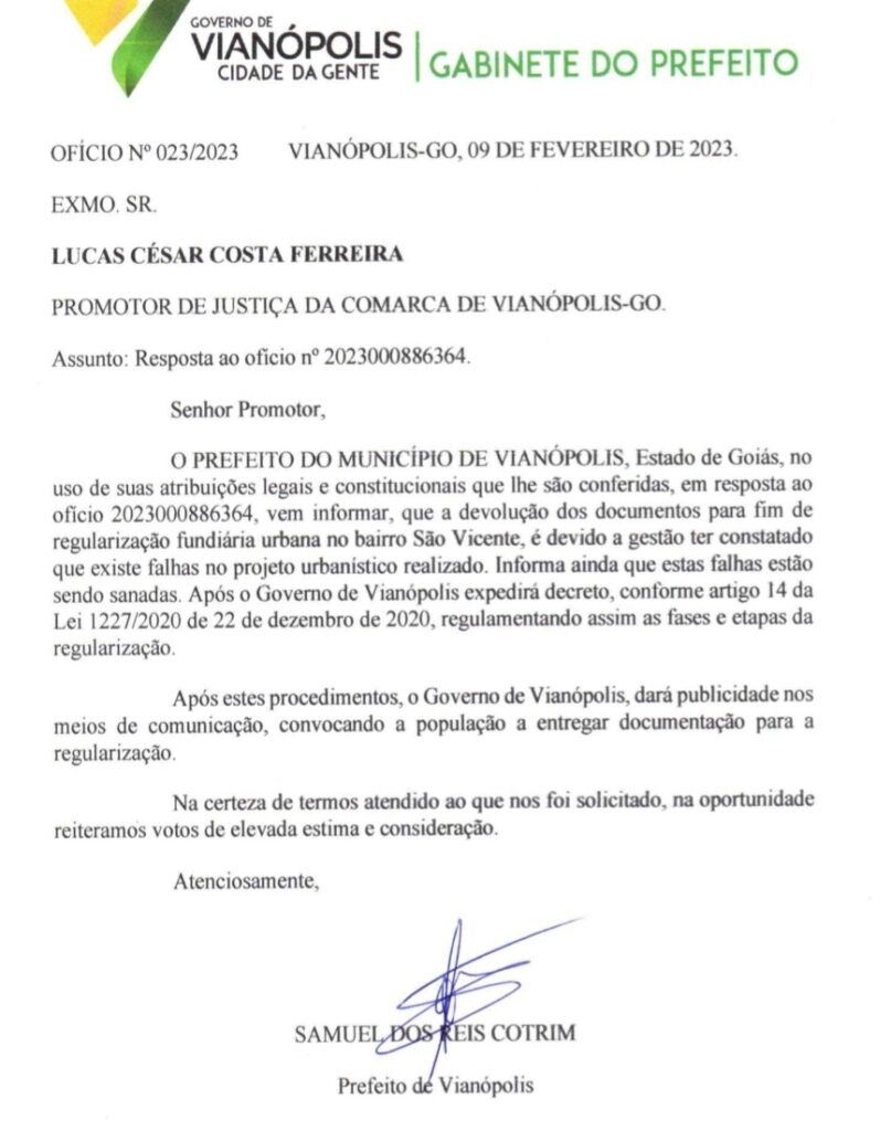 Em seguida, a moradora relatou o caso ao Promotor de Justiça de Vianópolis, Lucas César Costa Ferreira, que enviou ofício ao Prefeito Samuel Cotrim para saber sobre a regularização dos lotes do Bairro São Vicente.