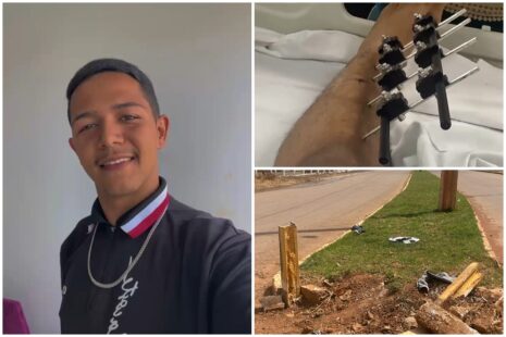 No choque lateral entre a motocicleta e o FIAT/STRADA, o jovem caiu e fraturou as duas pernas ao bater nas barras de trilho de ferro colocadas pela Prefeitura Municipal na administração do Ex-Prefeito, Samuel Cotrim.