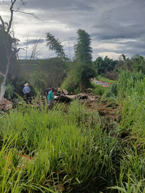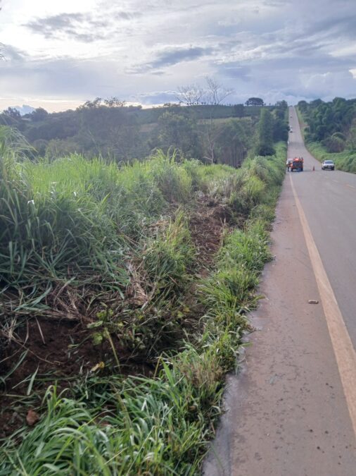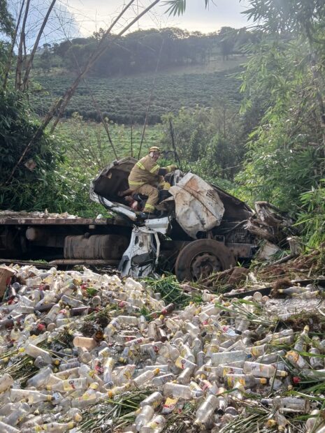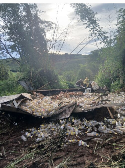O motorista perdeu o controle do caminhão, que invadiu a pista contrária e saiu para o mato, onde tombou próximo a um córrego.