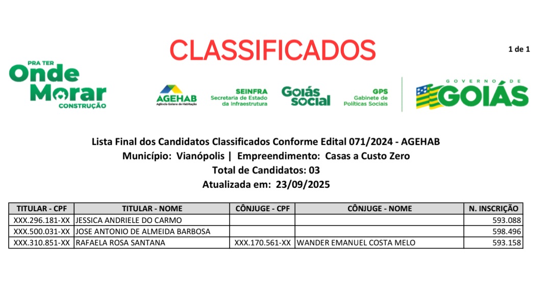 A AGEHAB-Agência Goiana de Habitação divulgou em seu site na data de hoje, 23/09, os nomes de quatro pessoas desclassificadas, assim como os nomes de três que foram classificadas para ganhar casas populares construídas no Residencial Blazi.