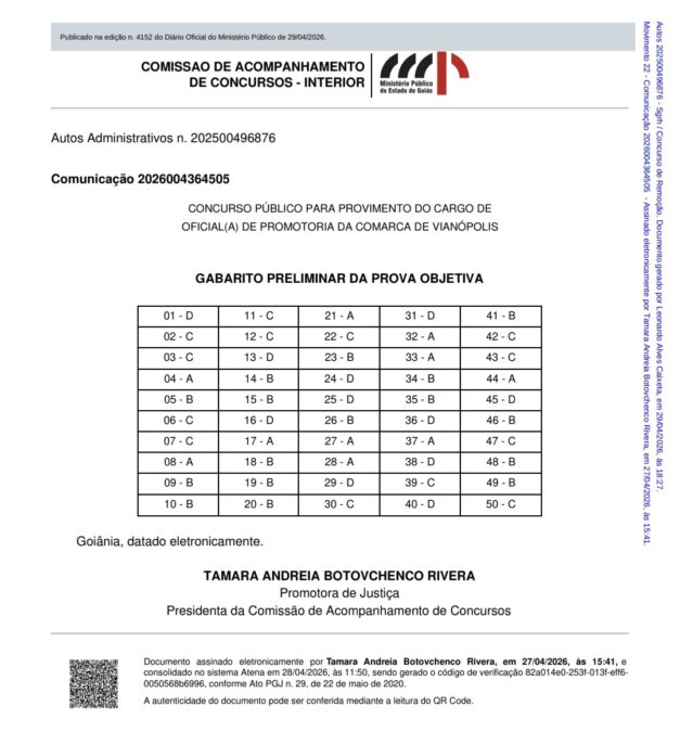 A Comissão de Acompanhamento do Concurso de Oficial de Promotoria para a Comarca de Vianópolis divulgou na tarde de hoje, 29/04, o gabarito preliminar da prova objetiva aplicada no último domingo em Vianópolis e Silvânia.
