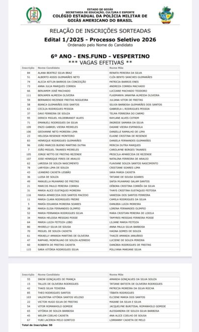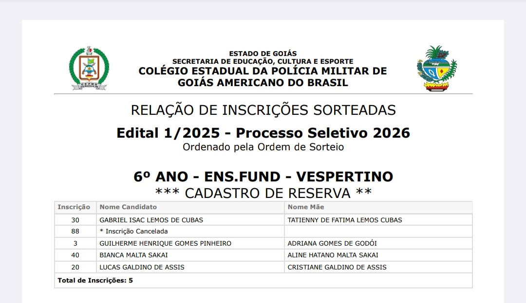 CONFIRA NOME DOS JOVENS SORTEADOS QUE ESTUDARÃO NO 6º ANO DO COLÉGIO MILITAR AMERICANO DO BRASIL EM 2026… SORTEIO DAS VAGAS DO 7º ANO SERÁ AMANHÃ, 12/11