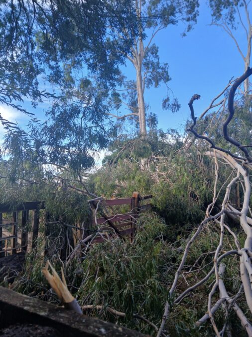 VENTOS FORTES DERRUBAM EUCALIPTO SOBRE GALPÃO E PARTE DE CURRAL NA ZONA RURAL DE VIANÓPOLIS