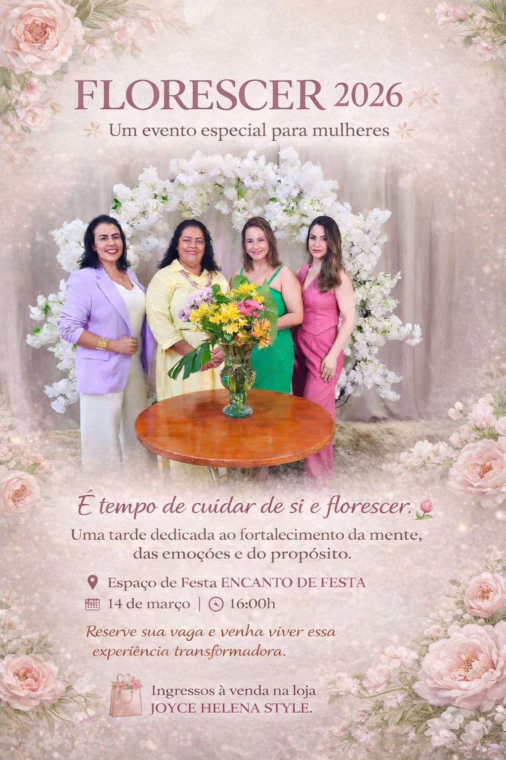 Os ingressos para o Evento Florescer 2026 podem ser adquiridos na loja JOYCE HELENA STYLE.
