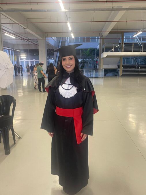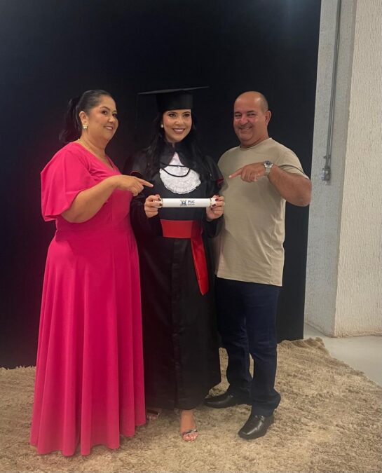 Já formada em Ciências Contábeis, ela agora concluiu também o curso de Direito, ambos pela tradicional Pontifícia Universidade Católica de Goiás (PUC Goiás).