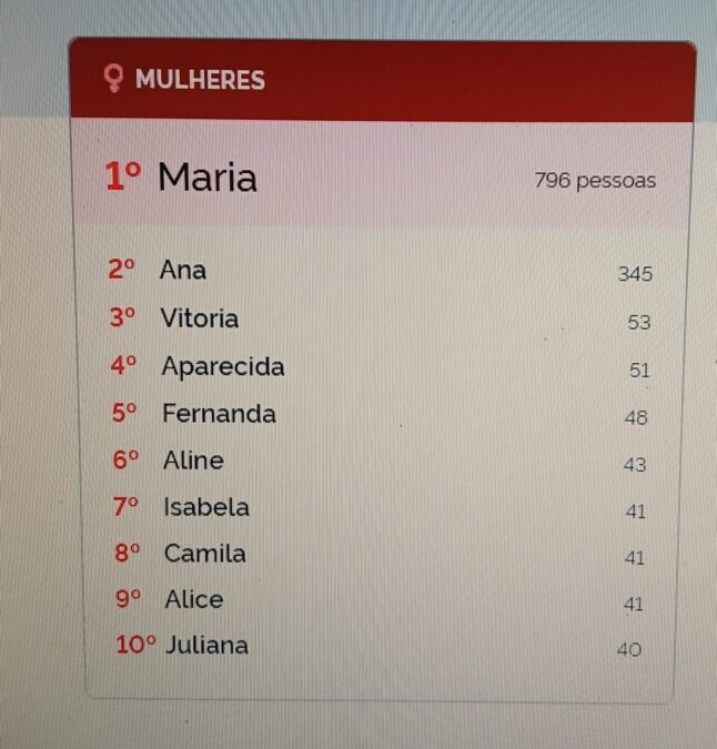Já em quarto lugar, está o nome Carlos, num total de 142, enquanto que Pedro está em quinto lugar, num total de 139.