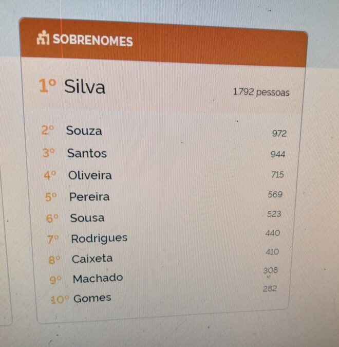 Em quarto lugar, existem 715 pessoas com o sobrenome Oliveira, sendo que em quinto lugar estão as pessoas com o sobrenome Pereira, num total de 569.