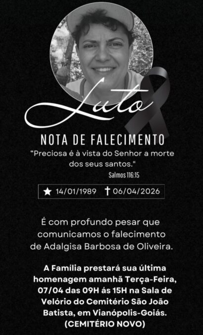 O corpo de Adalgisa será velado amanhã, 07/04, das 9h às 15h, na Sala de Velório do Novo Cemitério de Vianópolis.