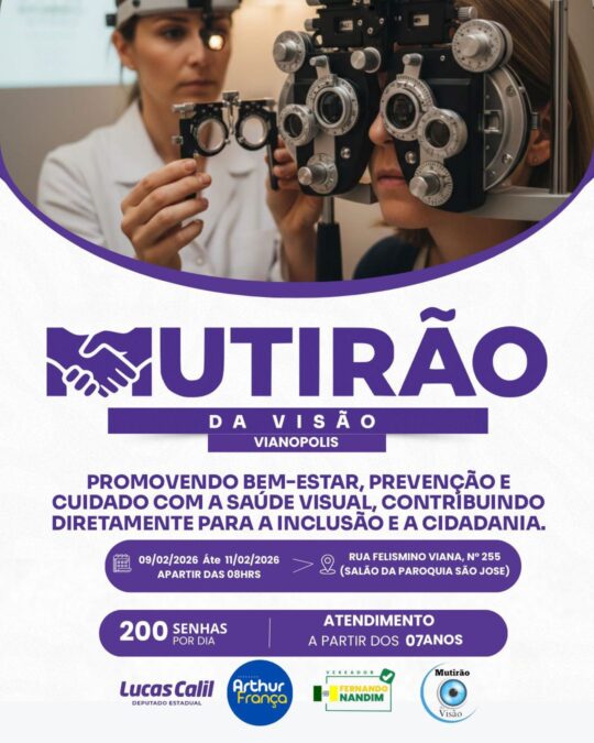 Organizado pelo Deputado Estadual Lucas Calil e pelos Vereadores Arthur França e Fernando Nandim, será realizado em Vianópolis, nos dias 9, 10 e 11 de fevereiro, o Mutirão da Visão.