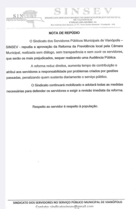 NOTA DE REPÚDIO DO SINSEV APÓS VEREADORES APROVAREM, EM 1ª VOTAÇÃO, PROJETO DE LEI DE REFORMA DA PREVIDÊNCIA MUNICIPAL